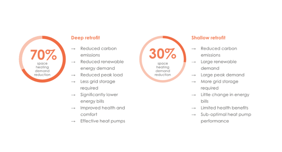 Best practice retrofit strategies will typically encourage a ‘deep retrofit’. Shallow retrofits should generally be avoided due to number disadvantages associated with suboptimal upgrade works. See image below on the example differences between deep retrofit vs. shallow retrofit.