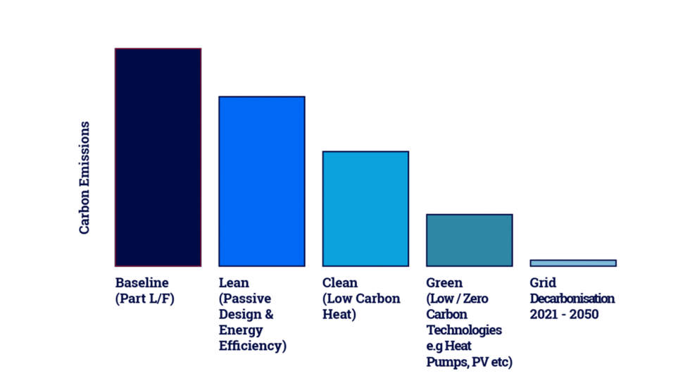 IN2 follow and develop an industry recognized best practice approach to achieving and future proofing for Zero Carbon in operation for both new and existing buildings. Whether new or existing, our designs will seek to follow an energy strategy to reduce demand and consumption.