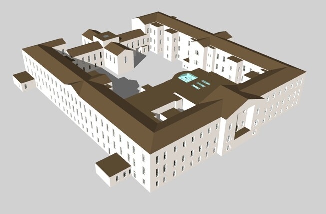 The Misericordiae building was constructed in 1861, posing unique challenges due to the building’s outdated existing fabric and integrated systems. Today, it is predominantly an administrative and outpatient support space and has steady occupancy and moderate thermal requirements, making it a strong early candidate for heat-pump deployment without extensive internal refurbishment. The proposal, therefore, replaces local gas boilers with a fully electrified heat-pump solution. Domestic hot water is converted to a heat-pump-led, stored-hot-water arrangement with periodic thermal disinfection under BMS control.