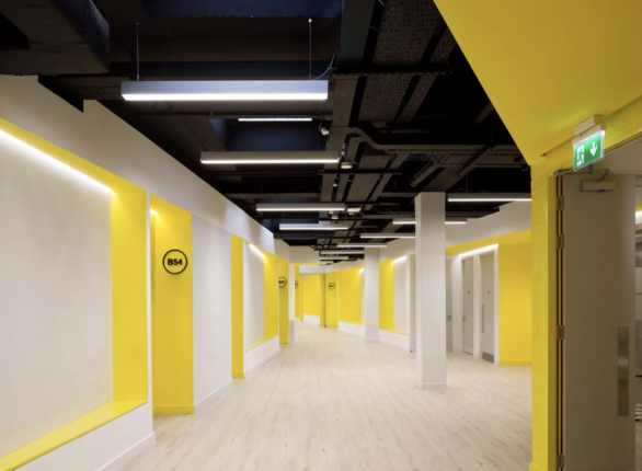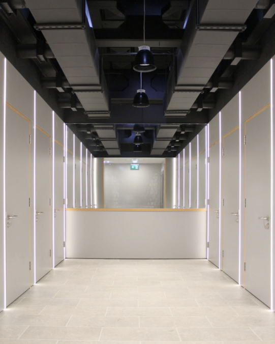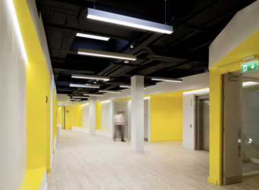 A estratégia de design para este projeto envolveu a instalação de uma parede central inclinada que abriga dutos de ventilação colocados irregularmente, formando um espaço de circulação expansivo. A área de circulação generosamente dimensionada forneceu espaços informais para sentar, troca de ideias e colaboração; claraboias existentes bloqueadas foram reabertas e os tetos existentes foram removidos para criar um ambiente de negócios dinâmico e contemporâneo.
