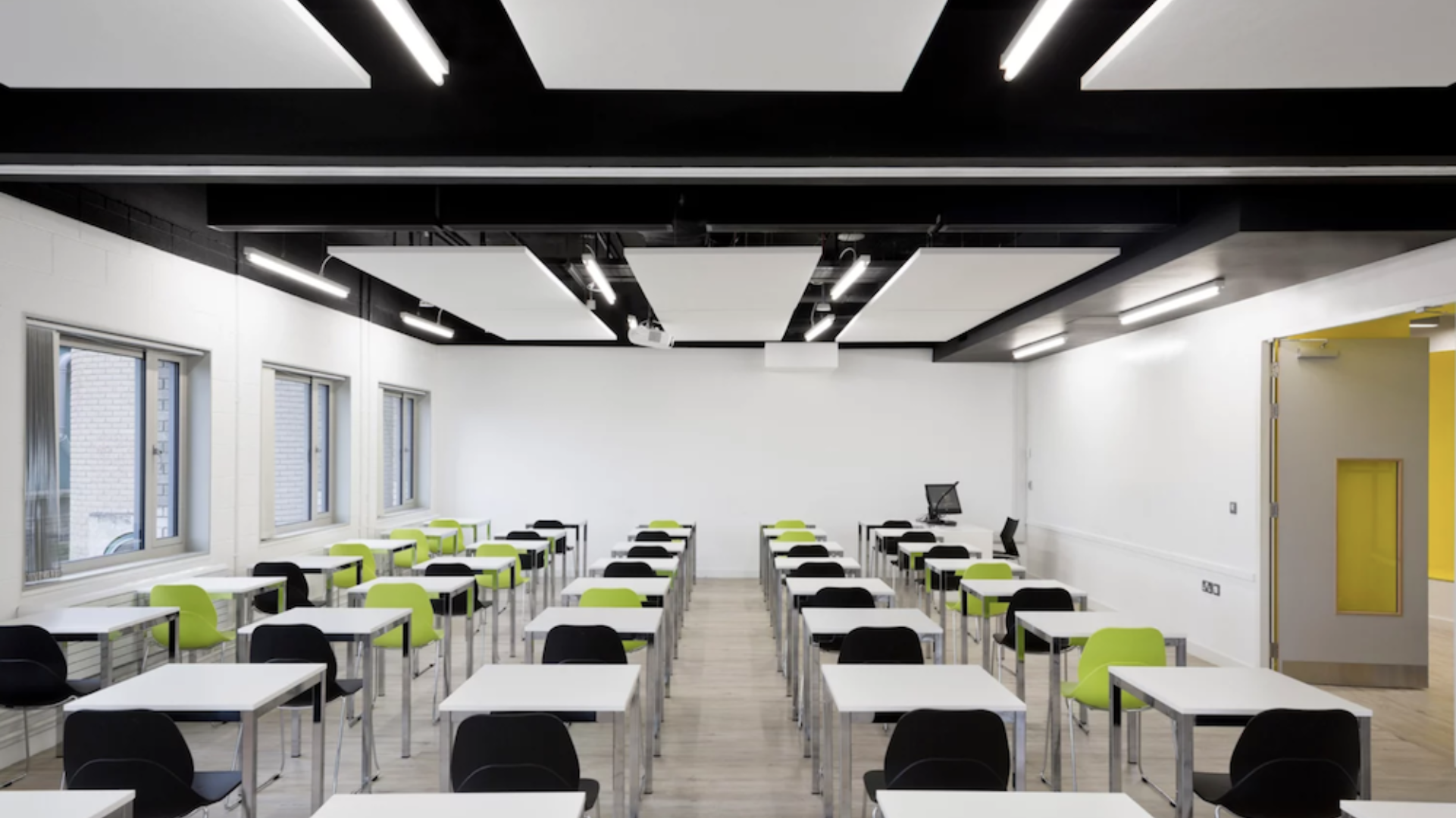 As salas de aula foram projetadas como duas salas maiores, permitindo o uso como salas de função ou salões de exame por subdivisão com divisórias dobráveis. Esses espaços de ensino apresentam painéis acústicos suspensos e quadros brancos de largura total em uma estratégia de design que é funcional, econômica e reflete uma demanda crescente por ambientes de trabalho e ensino dinâmicos e flexíveis.